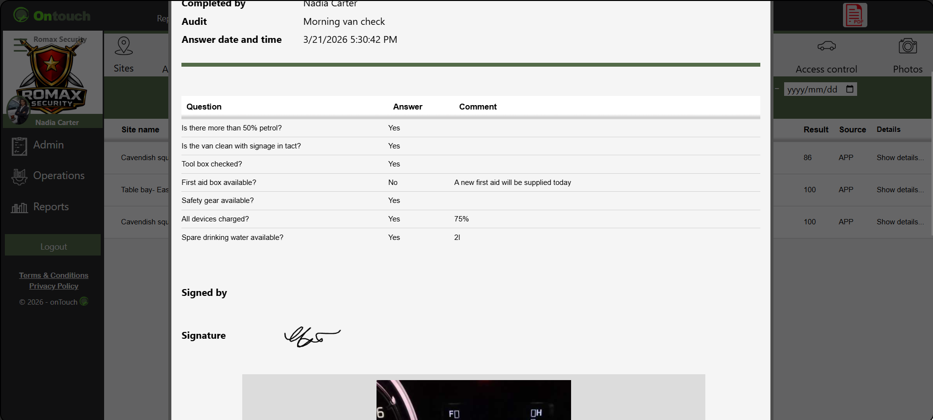 * Audit time duration  * Add comments  * Add photos  * Add signatures  * Different allocated and assigned question sets for all employees or sites  * Site arrival notifications  * Proof of delivery reports