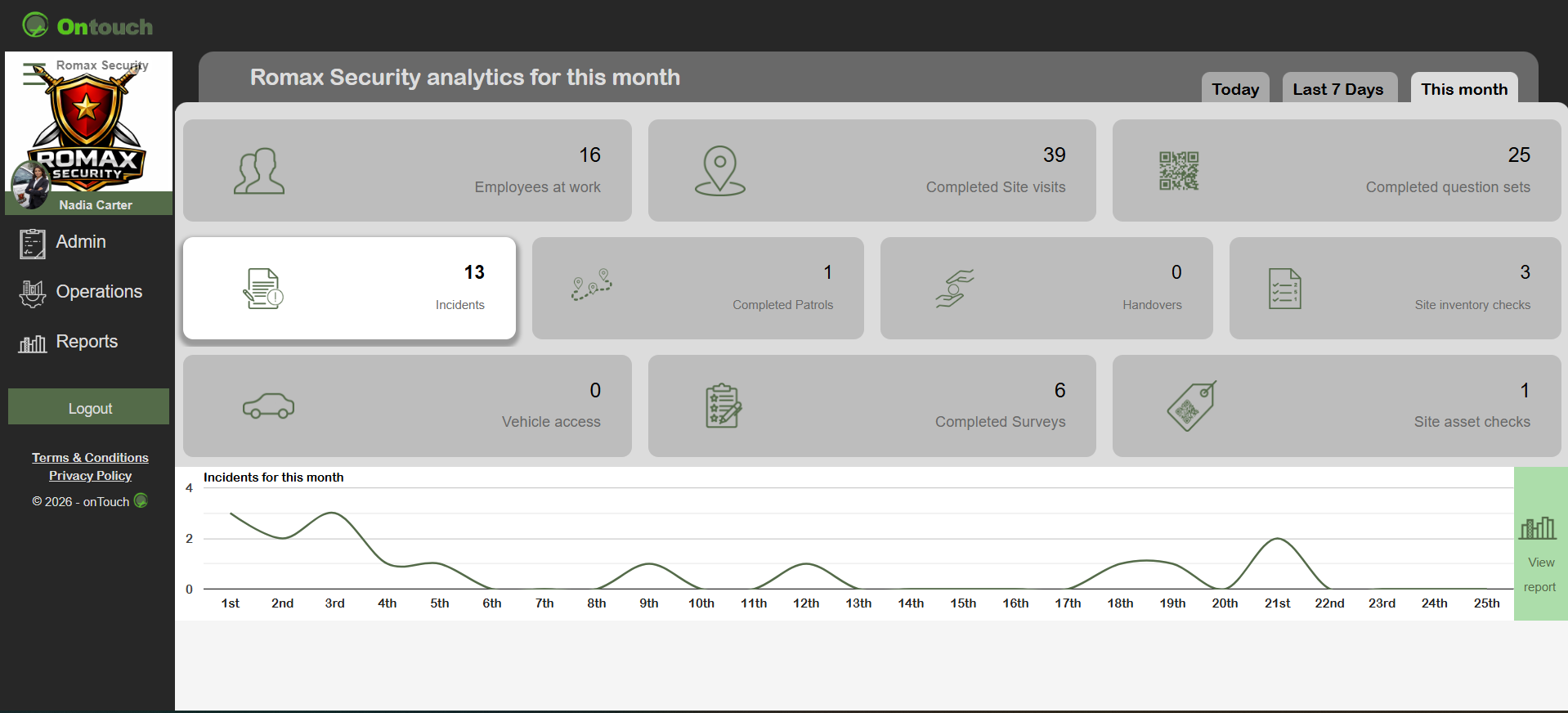 These reports include all relevant details, such as the employee code of the person reporting the incident, type of incident, date and time of incident, contact person if relevant, live photos and all comments.