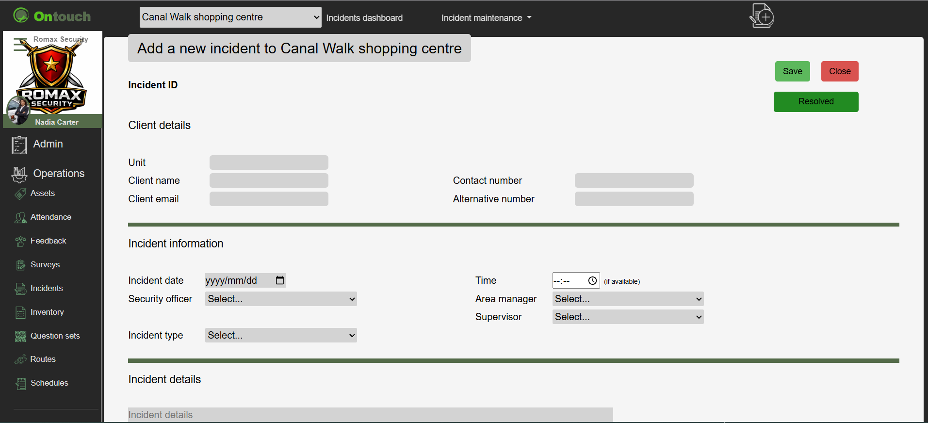 If you visit a site and notice any incidents or faults, you can report them immediately to your superiors through the incidents page.